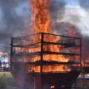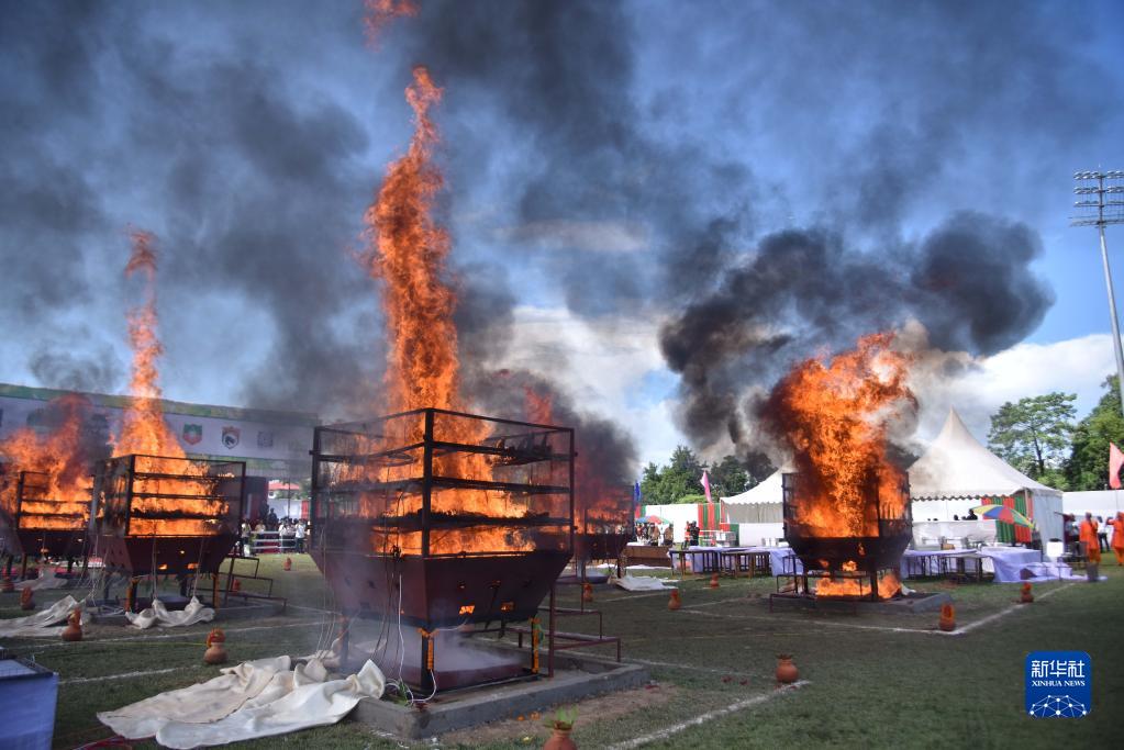 当地有关部门22日焚毁了一批收缴的犀牛角。