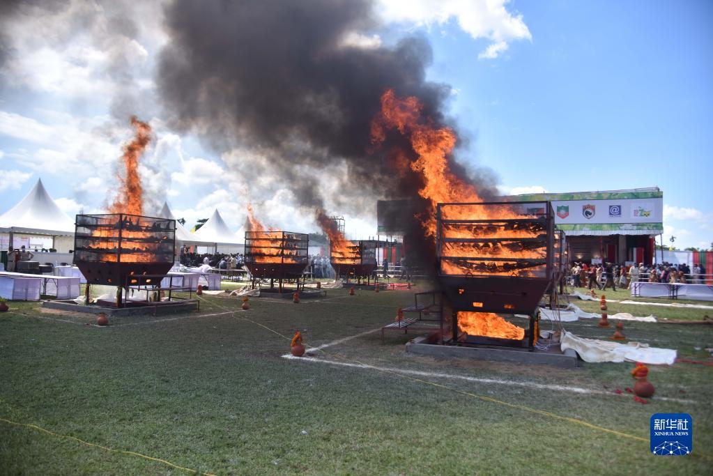 当地有关部门22日焚毁了一批收缴的犀牛角。
