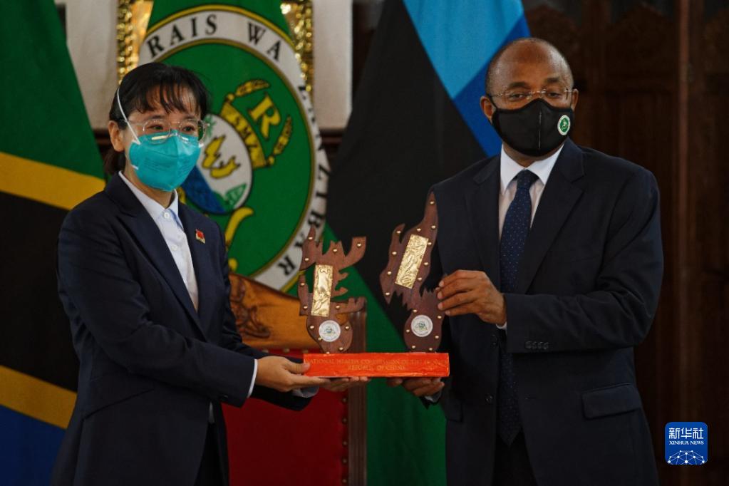 9月21日,坦桑尼亚桑给巴尔总统姆维尼(右)在桑给巴尔总统府为中国医疗队队员颁发奖杯。