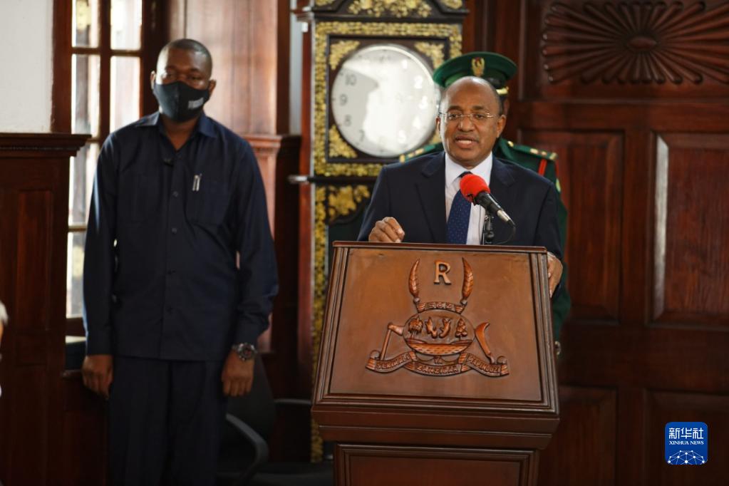 9月21日,坦桑尼亚桑给巴尔总统姆维尼(前)在桑给巴尔总统府讲话。