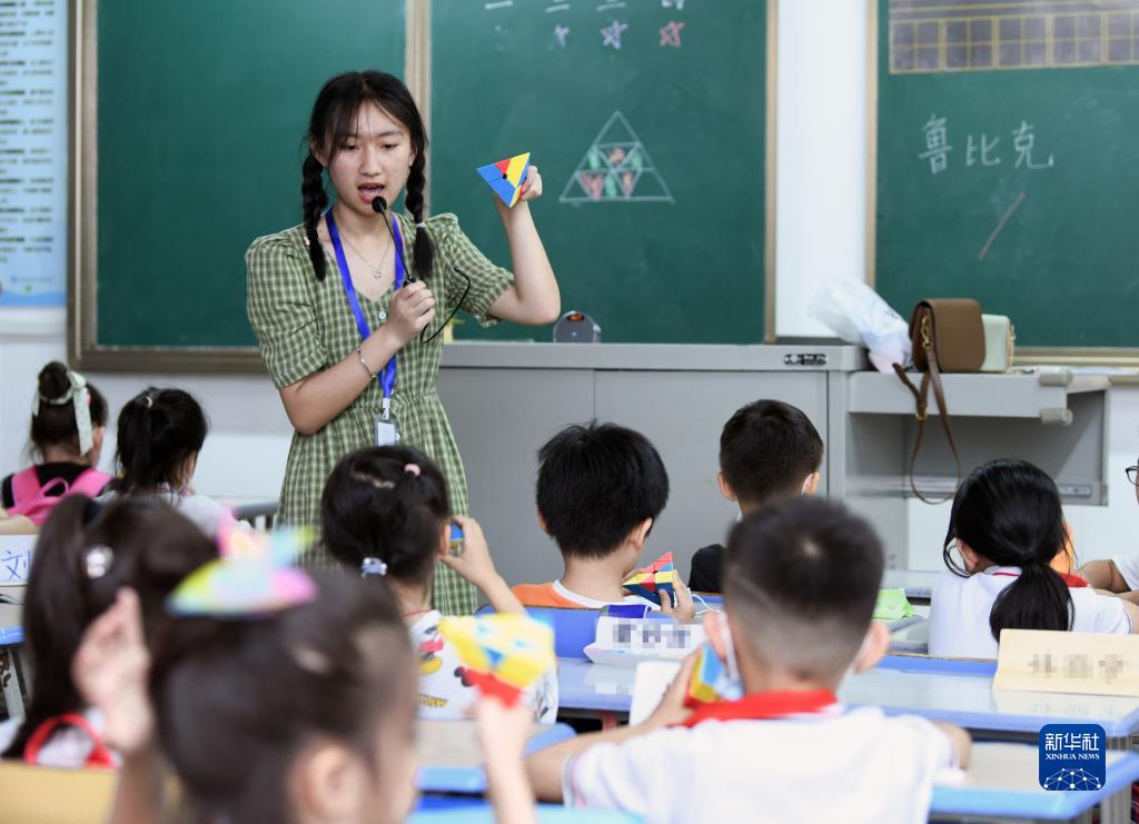 9月22日,合肥市稻香村小学岳西路校区老师在课后教孩子们学习魔方。