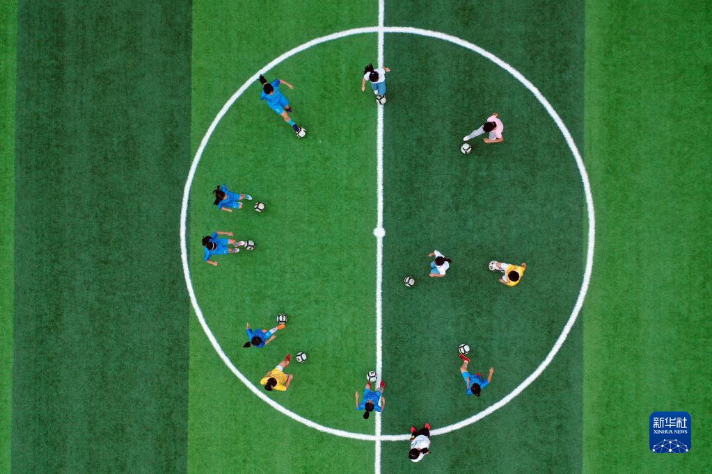 9月22日,合肥市稻香村小学岳西路校区学生在课后参加足球训练(无人机照片)。