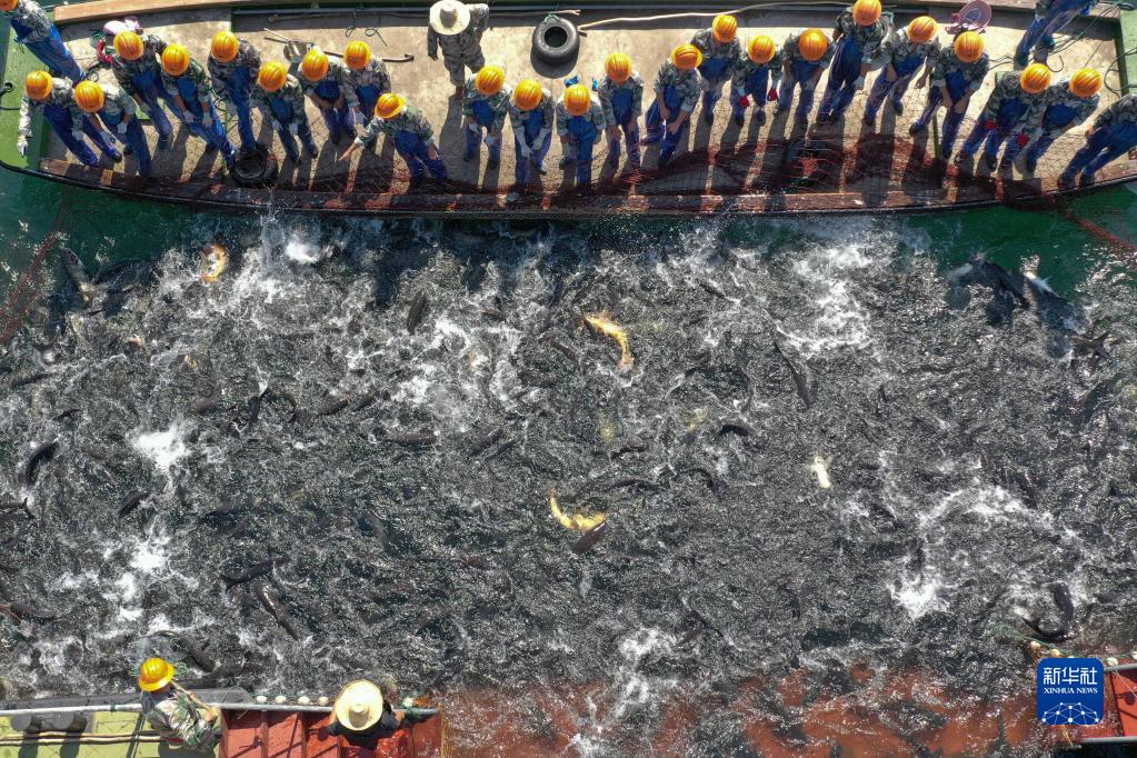 当日正值中国农民丰收节,浙江省淳安县千岛湖安阳口水域上演巨网捕鱼,捕捞队员合力拉网,捕获12万多斤鲢鱼、鳙鱼。