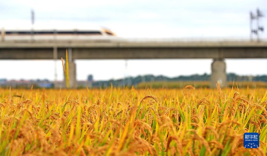 9月22日,在辽宁省铁岭县腰堡镇,高铁列车从金色的稻田旁经过。