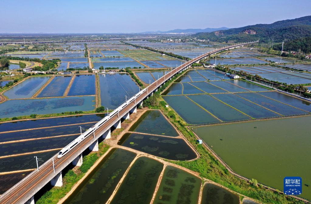 9月22日,列车从安徽省全椒县十字镇滁河圩区水产养殖基地上奔驰而过(无人机照片)。