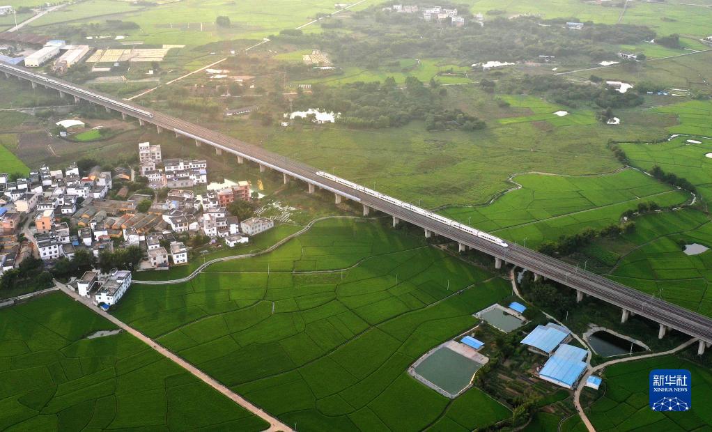 动车从广西宾阳县古辣镇的稻田间驶过(9月19日摄,无人机照片)。