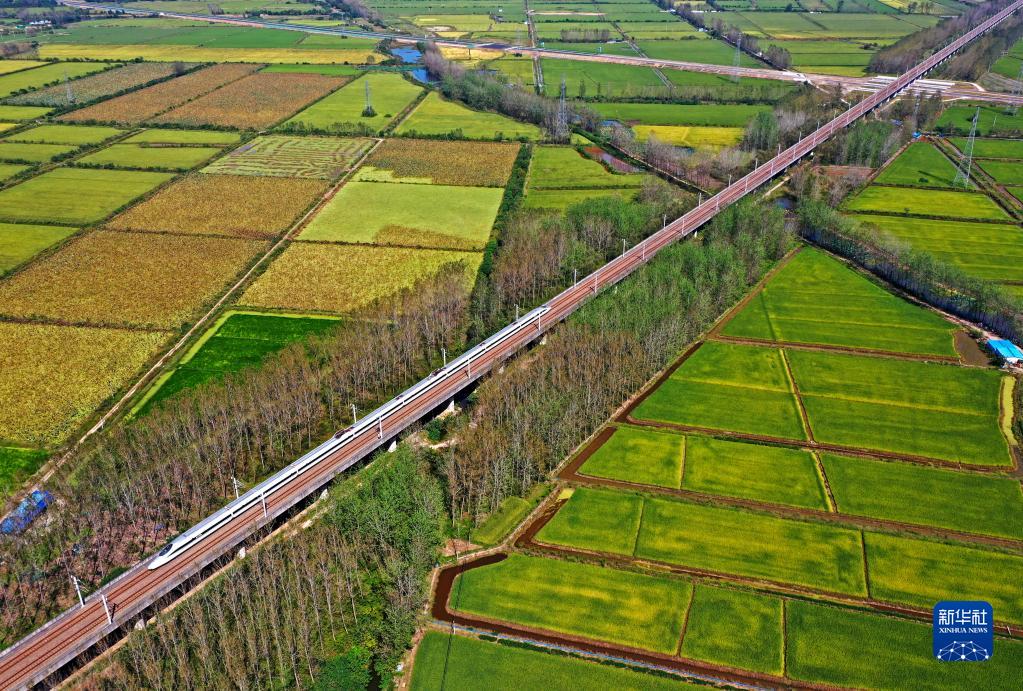 9月22日,列车从安徽省全椒县十字镇陈浅村稻田旁奔驰而过(无人机照片)。