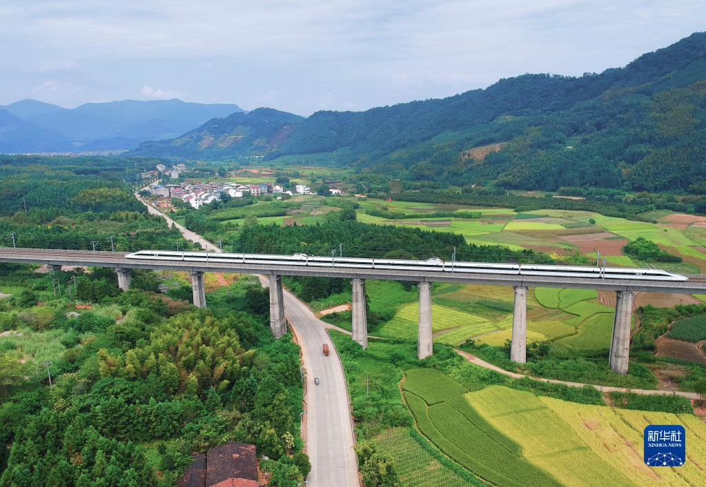 9月23日,在福建省南平市建瓯市徐墩镇丰乐村,高铁列车从田野上飞驰而过(无人机照片)。