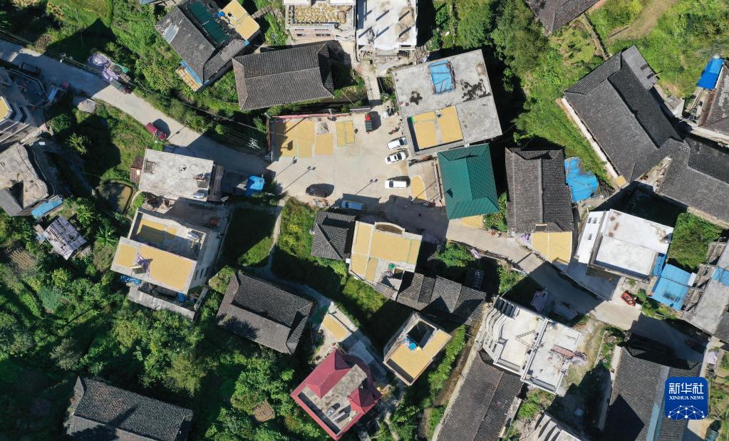 广西融水苗族自治县杆洞乡中讲村村民在房顶晒秋(9月16日摄,无人机照片)。