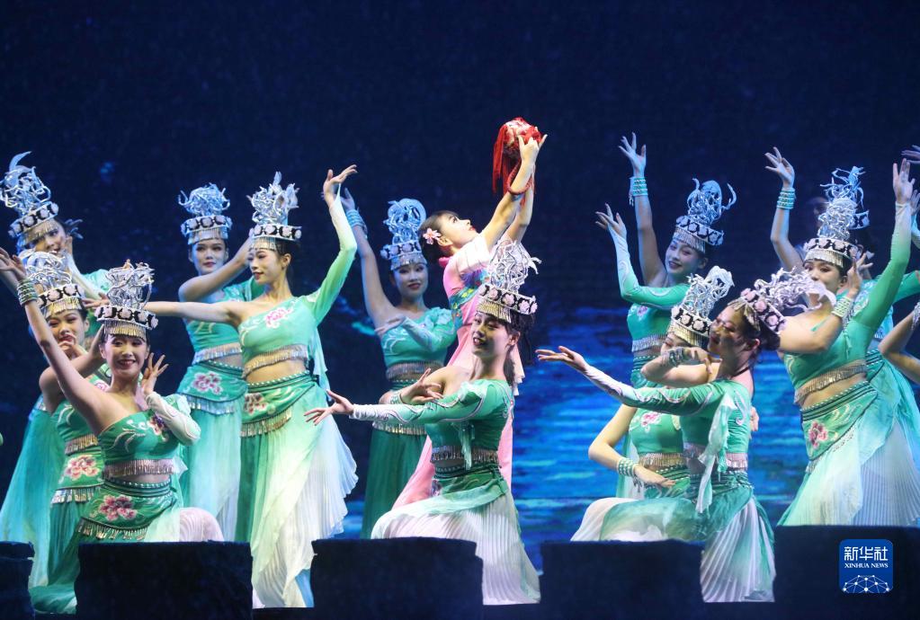 9月22日晚,湖南张家界魅力湘西艺术团的演员在舞台上表演。