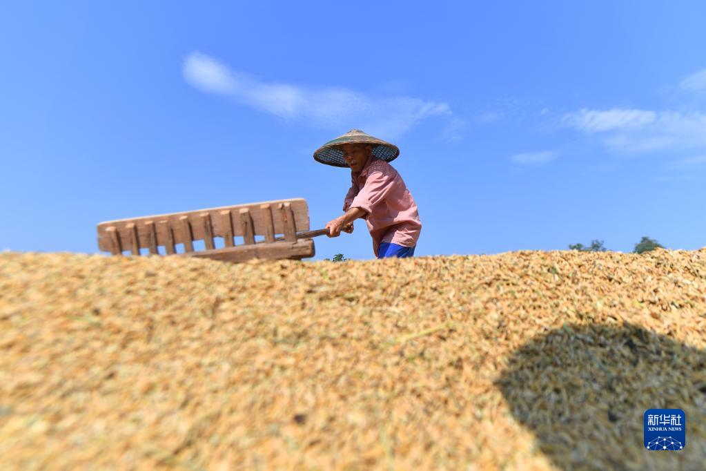 9月23日,在湖南省衡阳市常宁市官岭镇,农民在晾晒稻谷。