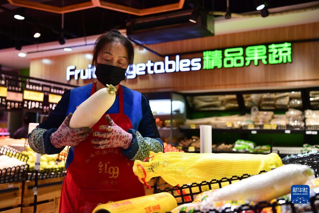 9月23日,在哈尔滨市巴彦县兴隆镇一超市,工作人员为订货居民挑选蔬菜。
