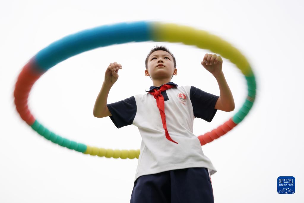 9月23日,河北省邢台市内丘县实验小学学生在“第二课堂”练习呼啦圈。