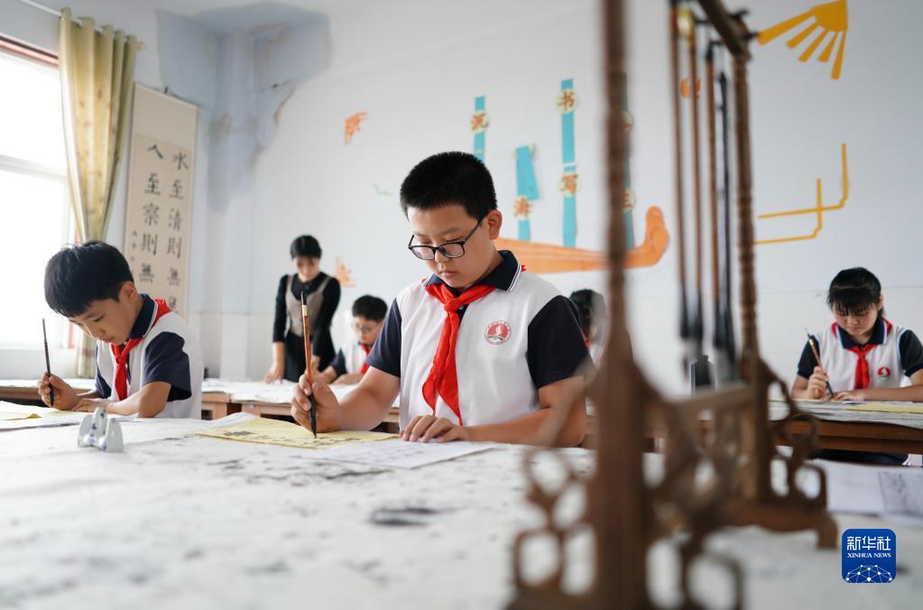 9月23日,河北省邢台市内丘县实验小学学生在“第二课堂”练习书法。