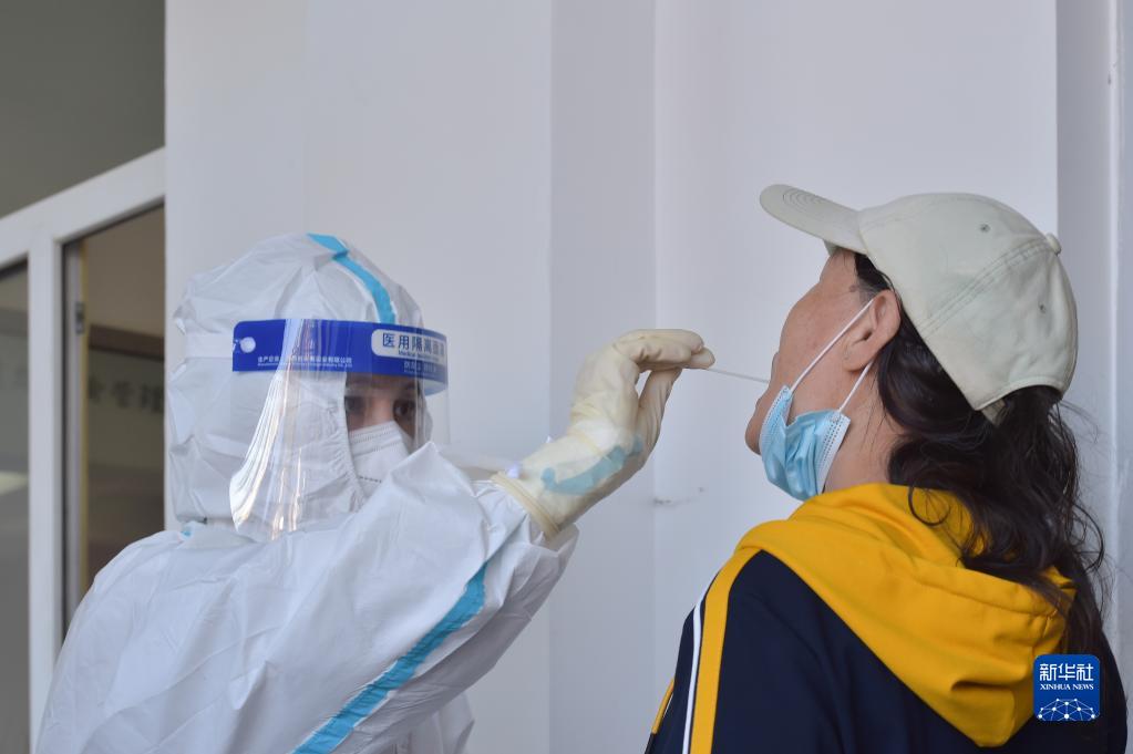 9月23日,在哈尔滨市巴彦县兴隆镇一处核酸检测点,医务人员为居民进行核酸检测取样。
