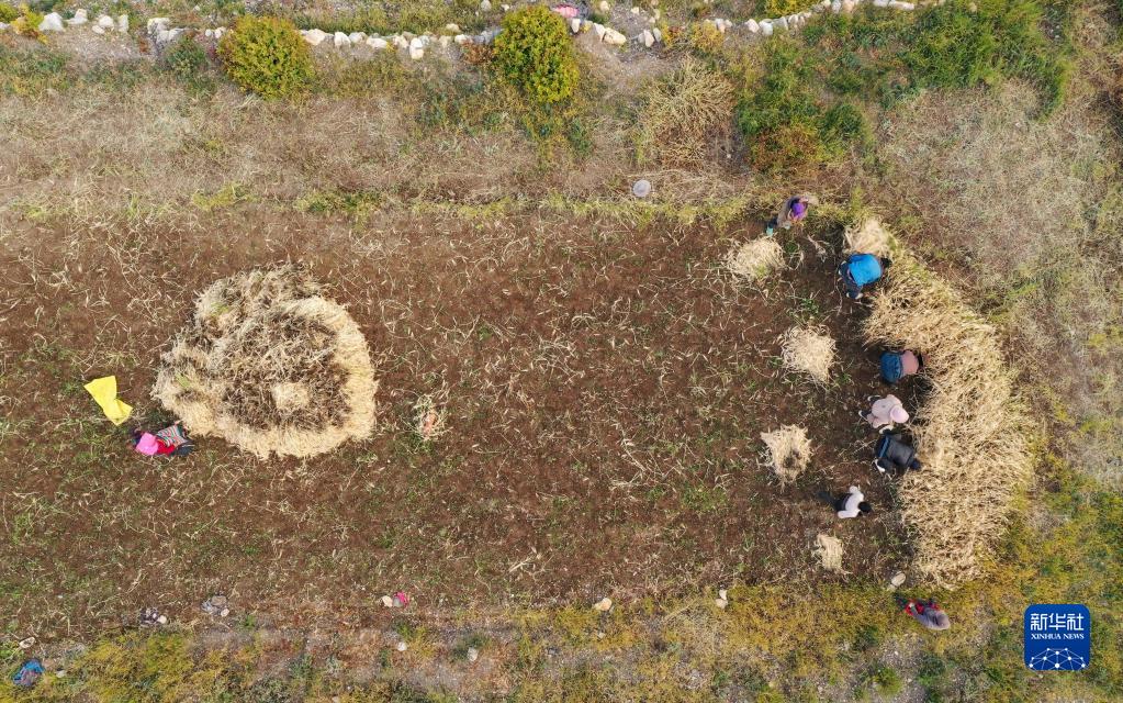 9月23日清晨,西藏那曲市尼玛县文部乡文部南村村民开镰收割(无人机照片)。