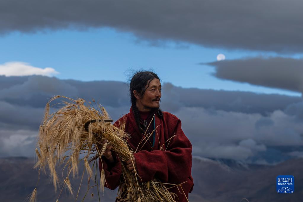 9月23日清晨,西藏那曲市尼玛县文部乡文部南村村民开镰收割。