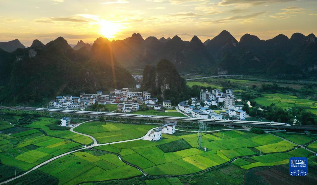 秋日,广西柳州市水稻长势喜人,丰收在望。动车组列车从稻田旁驶过,与村庄、山峦等构成一幅幅美丽的乡村图画。