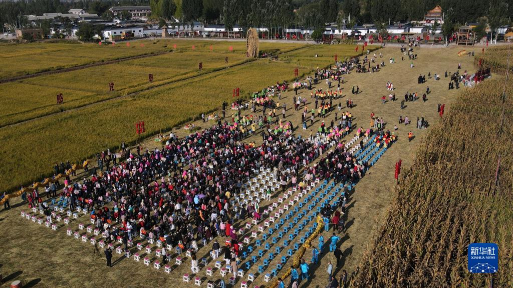 9月23日,宁夏青铜峡市韦桥村中国农民丰收节活动在田野间举行(无人机照片)。