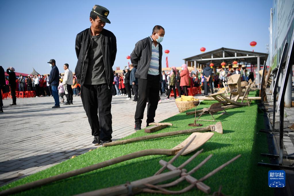 9月23日,农民在宁夏石嘴山市平罗县举办的中国农民丰收节活动上观看农耕文化展。