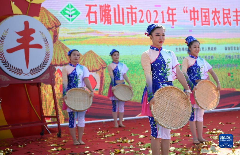 9月23日,演员在宁夏石嘴山市平罗县举办的中国农民丰收节活动上表演丰收舞。