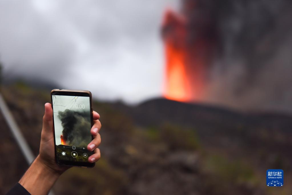 9月22日,一名男子在西班牙拉帕尔马岛拍摄老昆布雷火山喷发。