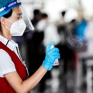 在哈尔滨太平国际机场,一名旅客在整理口罩(9月23日摄)。