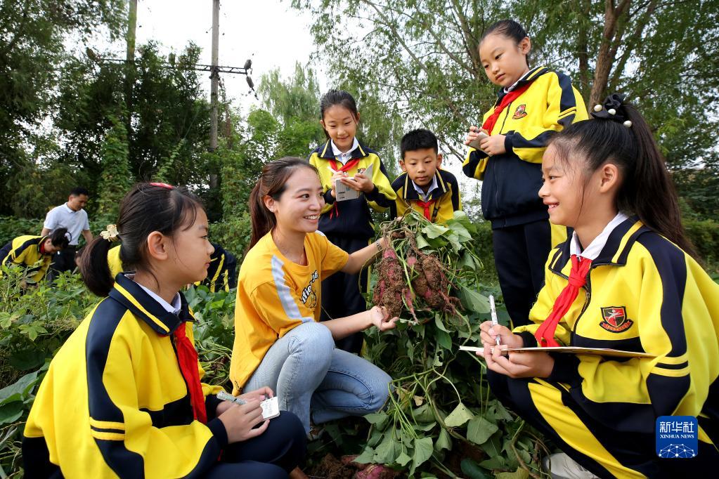 9月24日,在枣庄市市中区中兴小学的劳动实践基地,老师李肖琳(前中)在向学生讲解地瓜的栽培知识。