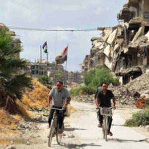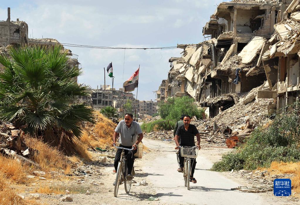 9月23日,在叙利亚首都大马士革城南的巴勒斯坦难民聚居区——耶尔穆克难民营,骑车人在废墟间骑行。