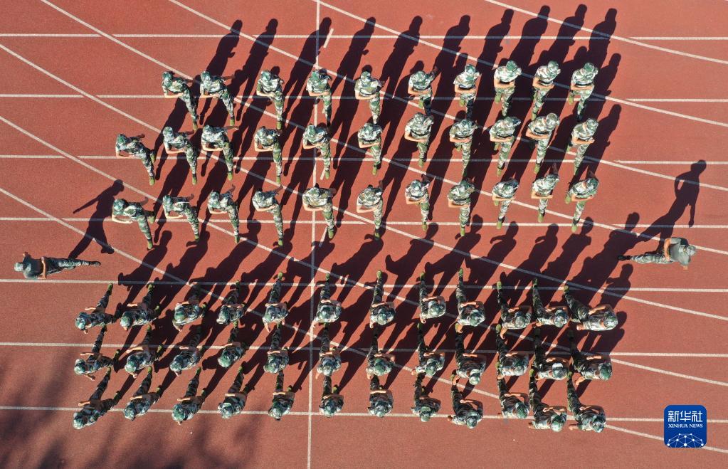 9月24日,在湖南省衡阳市南华大学田径运动场,南华大学2021级新生在进行正步训练(无人机照片)。