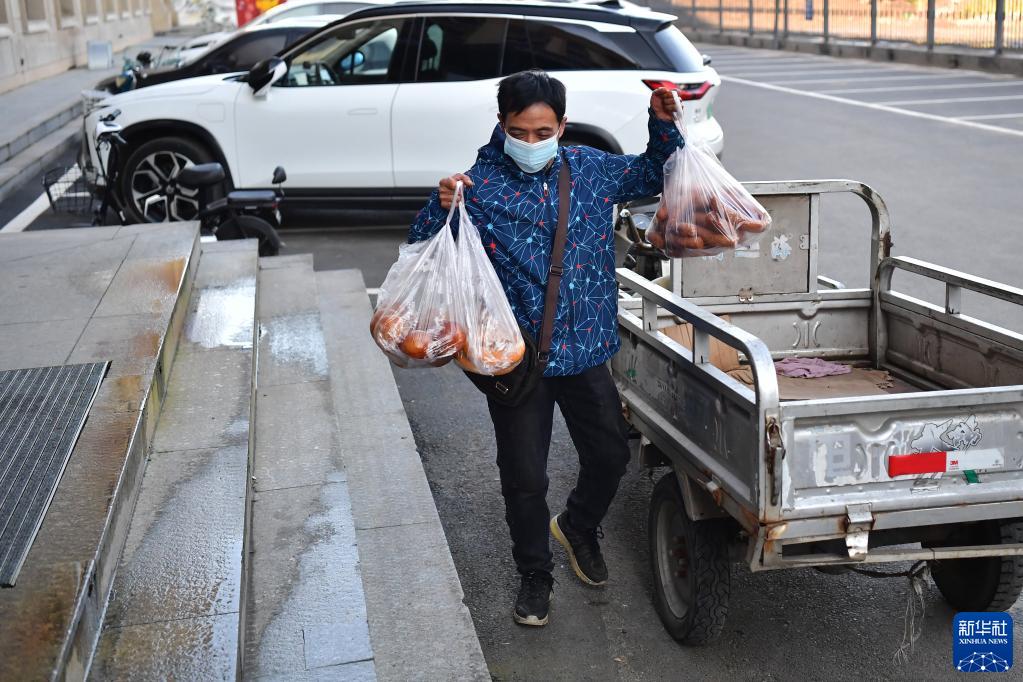 9月24日,在黑龙江省哈尔滨市巴彦县,超市工作人员在配送一宾馆订购的生活物资。
