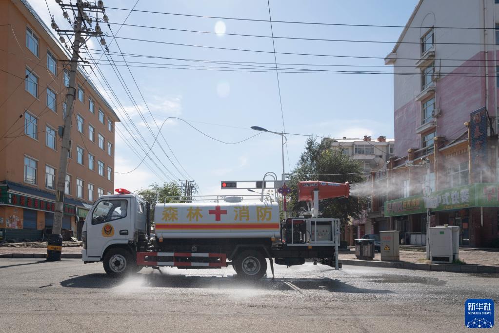 9月24日,在哈尔滨市巴彦县兴隆镇,哈尔滨市森林消防支队兴隆大队的消防员驾驶车辆对街道进行消杀。