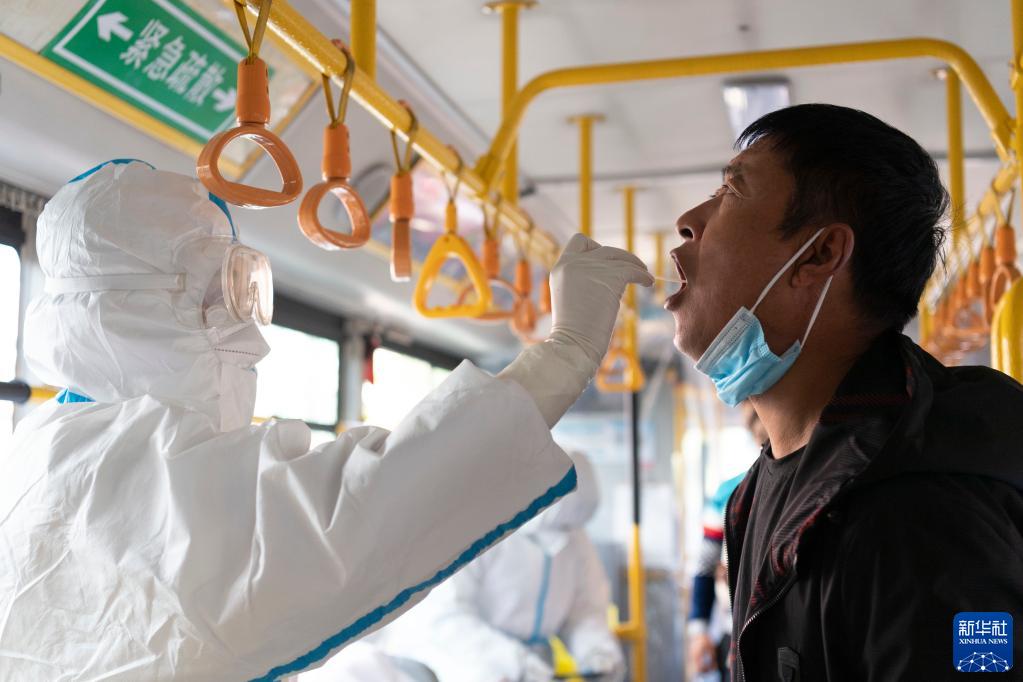 9月24日,在哈尔滨市巴彦县兴隆镇一处流动核酸检测点,医务人员为居民进行核酸检测取样。