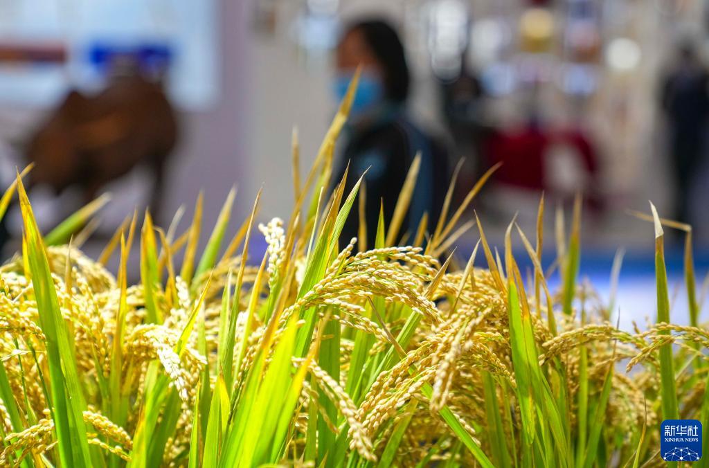 9月24日,参观者在中国—东北亚博览会上参观展出的高产耐盐碱水稻品种。