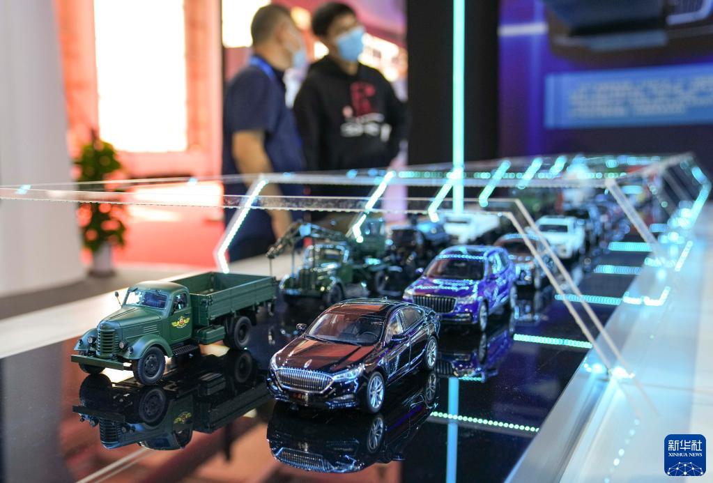 9月24日,参观者在中国—东北亚博览会上参观中国一汽生产的车辆模型。
