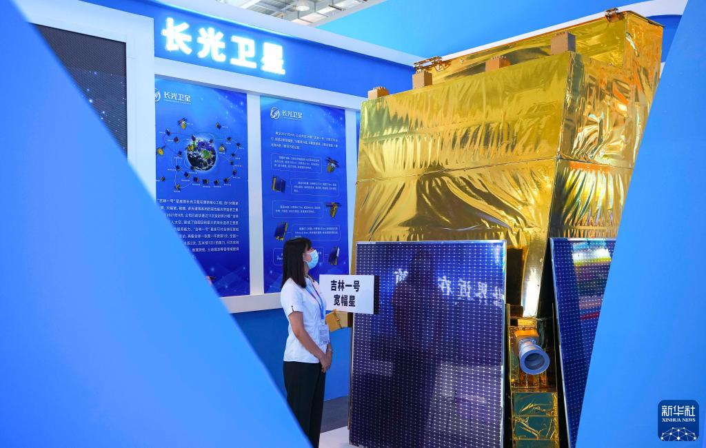 9月24日,参观者在中国—东北亚博览会上参观展出的“吉林一号”光学遥感卫星等比模型。
