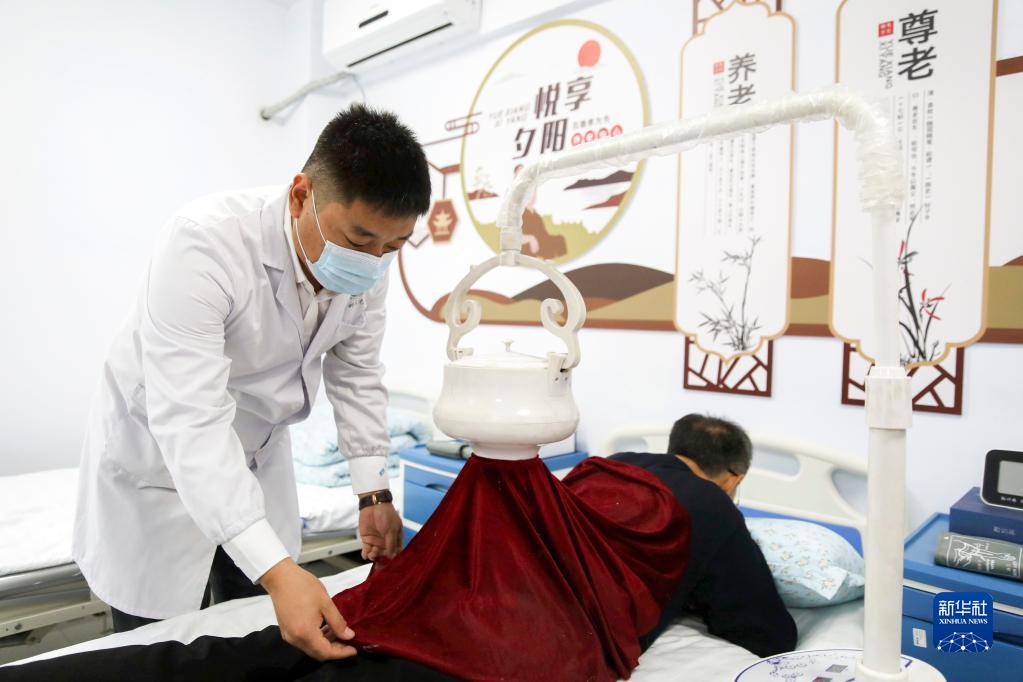 9月24日,在承德市双桥区石洞子沟街道永安街社区居家养老服务中心,工作人员为老年人提供理疗服务。