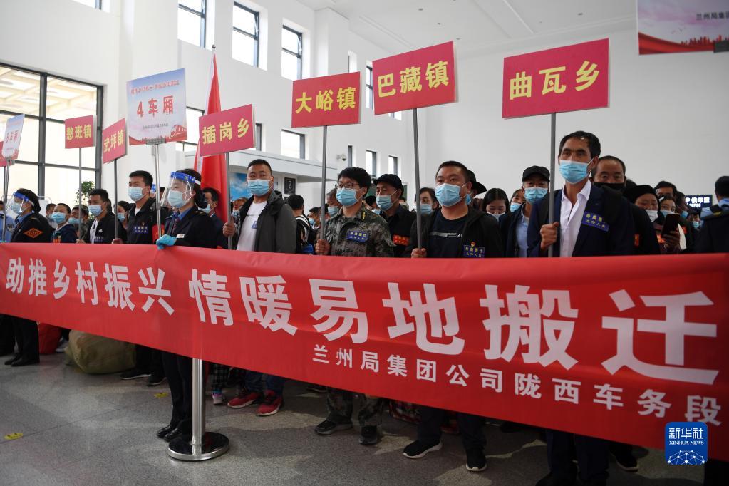 当日,甘肃省甘南藏族自治州舟曲县9个乡镇的200户500余名居民乘坐中国铁路兰州局集团有限公司开行的舟曲避险搬迁“感恩号”专列前往兰州新区安家。据介绍,今年以来,甘肃省启动舟曲县地质灾害避险搬迁工作,计划年底前搬迁770户2960人到兰州新区安家,此次搬迁的200户居民是首次借助铁路专列运输形式实施搬迁。新华社记者 范培珅 摄
