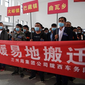 当日,甘肃省甘南藏族自治州舟曲县9个乡镇的200户500余名居民乘坐中国铁路兰州局集团有限公司开行的舟曲避险搬迁“感恩号”专列前往兰州新区安家。据介绍,今年以来,甘肃省启动舟曲县地质灾害避险搬迁工作,计划年底前搬迁770户2960人到兰州新区安家,此次搬迁的200户居民是首次借助铁路专列运输形式实施搬迁。新华社记者 范培珅 摄
