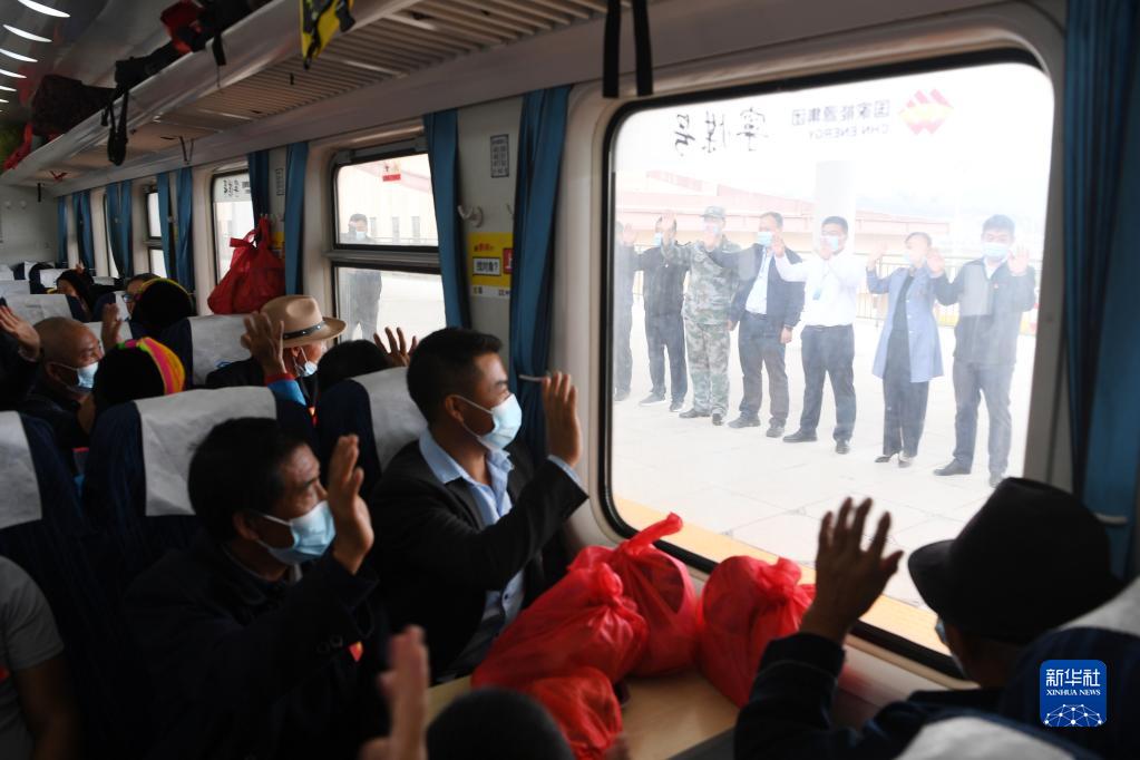 当日,甘肃省甘南藏族自治州舟曲县9个乡镇的200户500余名居民乘坐中国铁路兰州局集团有限公司开行的舟曲避险搬迁“感恩号”专列前往兰州新区安家。据介绍,今年以来,甘肃省启动舟曲县地质灾害避险搬迁工作,计划年底前搬迁770户2960人到兰州新区安家,此次搬迁的200户居民是首次借助铁路专列运输形式实施搬迁。新华社记者 范培珅 摄
