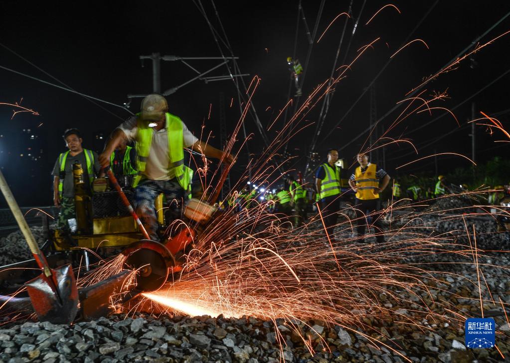 9月25日,施工人员在东莞塘厦赣深高铁拨接广深铁路现场切割钢轨。