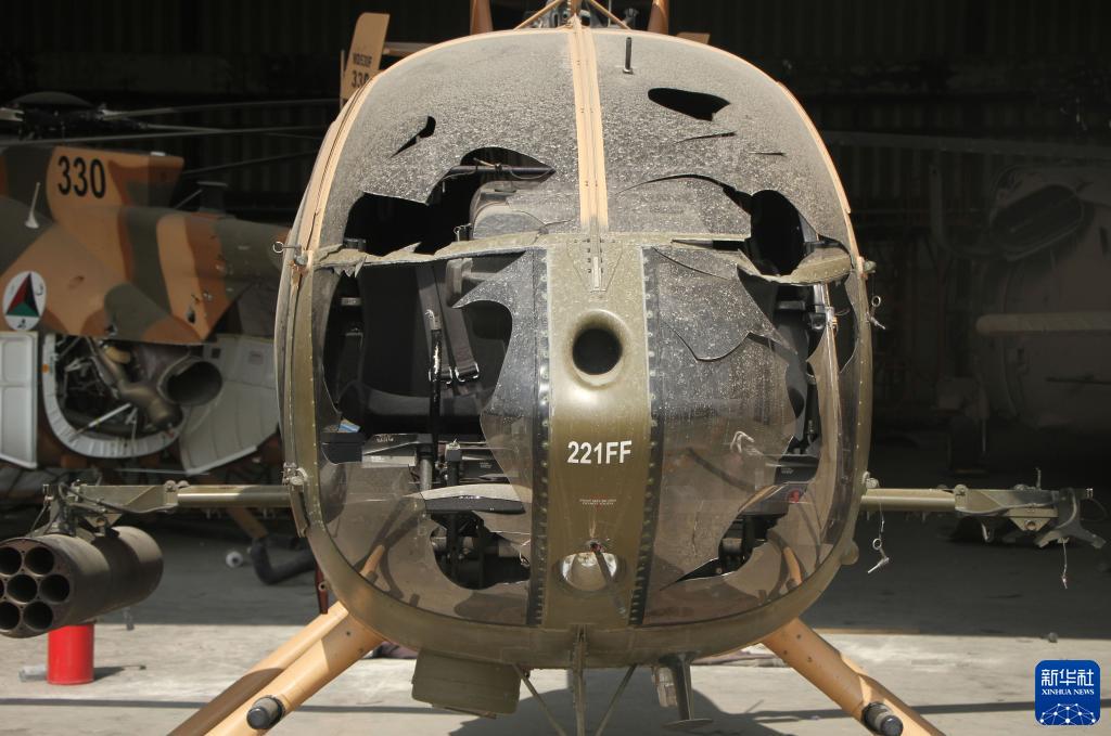 这是9月20日在阿富汗喀布尔机场拍摄的被毁坏的阿富汗空军直升机。