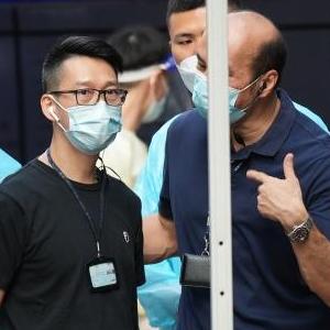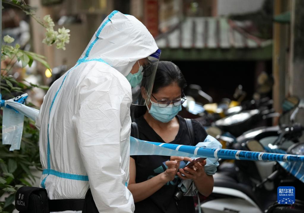 9月25日,工作人员在澳门第65例新冠肺炎确诊病例居住的大厦周边工作。新华社发