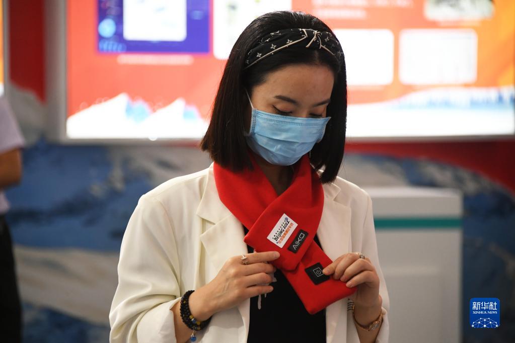 9月25日,在中关村论坛展览(科博会)现场,观众体验石墨烯智能发热围巾。