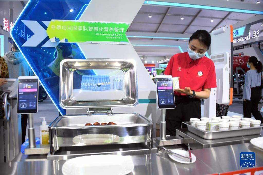 9月25日,在中关村论坛展览(科博会)现场,工作人员介绍智慧餐台,它可以记录运动员膳食营养摄入情况。