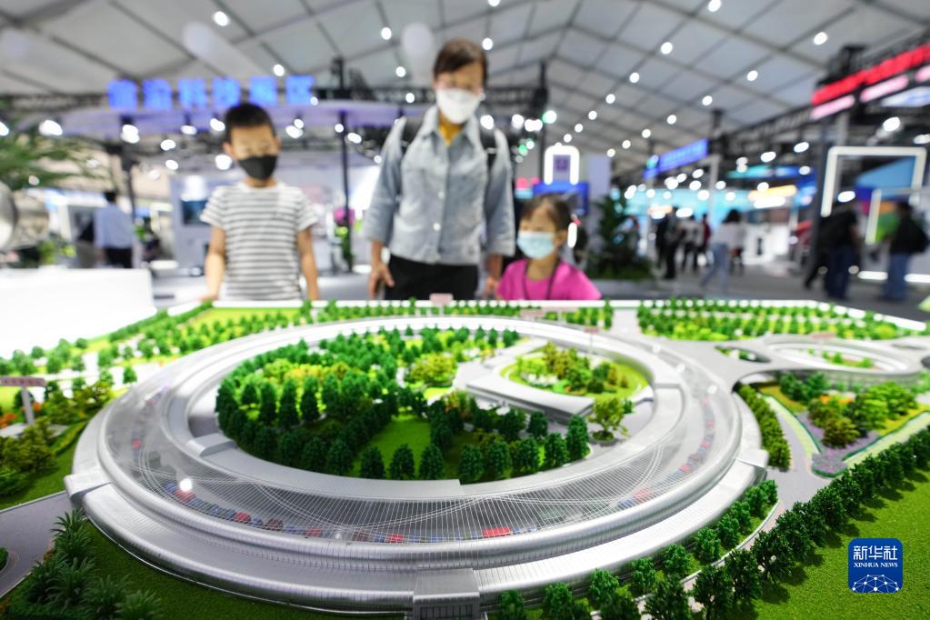 9月25日,参观者在中关村论坛展览(科博会)观看展出的高能同步辐射光源模型。