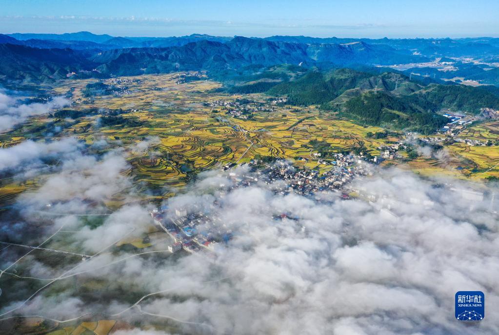 9月21日在贵州省黔南布依族苗族自治州龙里县湾滩河镇拍摄的雾中晨景(无人机照片)。