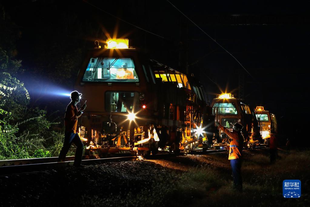 9月20日夜间,中国铁路南昌局集团有限公司鹰潭工务机械段的工作人员进行机械化施工作业。中秋假期期间,这些工作人员住在由火车车厢改造成的宿营“大篷车”上,坚守岗位,保障旅客安全高效出行。