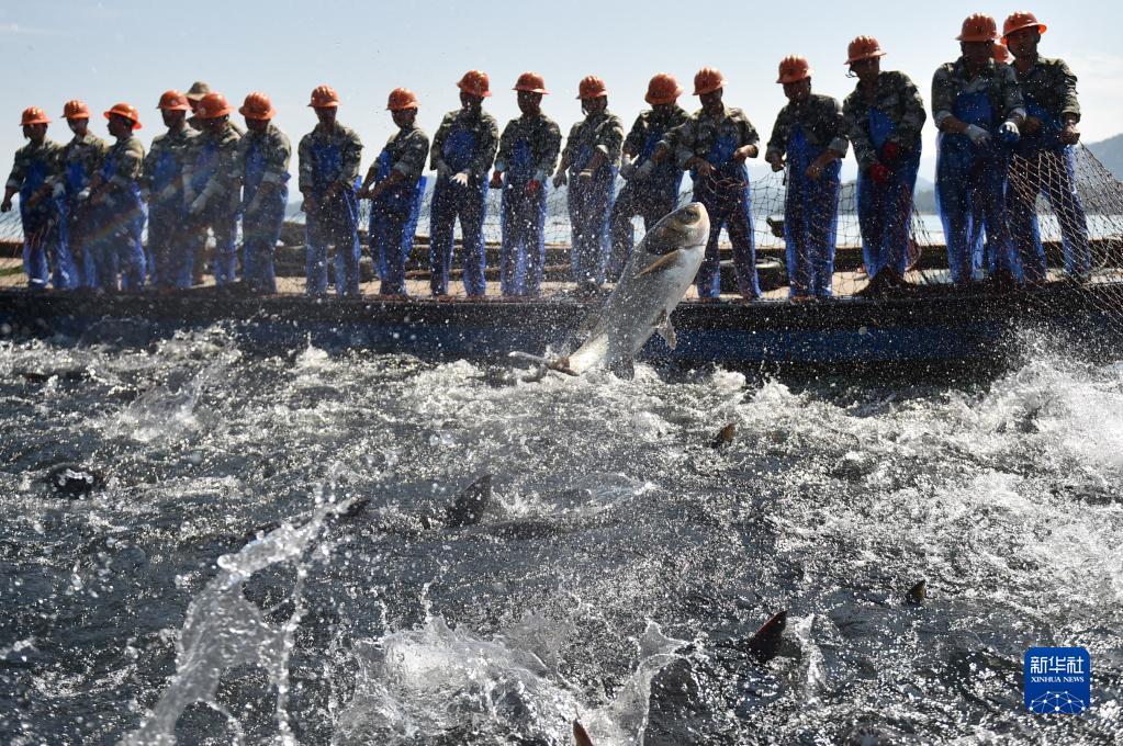 9月23日,捕捞队员在浙江省淳安县千岛湖安阳口水域使用巨网合力捕鱼。