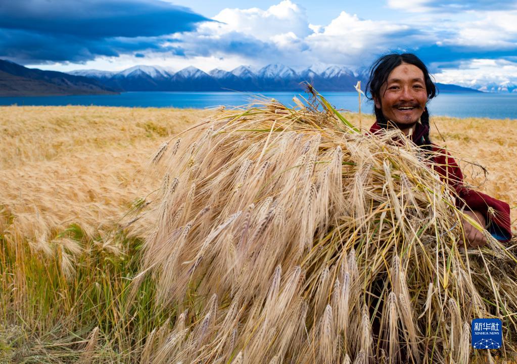9月23日,西藏那曲市尼玛县文部乡文部南村村民开镰收割。文部南村位于当惹雍措湖畔,海拔4645米,这里的村民以“萨马卓”(半农半牧之意)为主,在藏北高原独具特色。